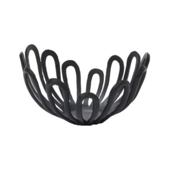 Give coffee table & shelf displays an upgrade with the sculptural form & stunning shape of the cast aluminum open decorative Altamonte Bowl in black. Large open petal shapes extend from the center base, curve upwards, & stop at varying heights. This versatile piece can be styled with fruit as kitchen decor, on its own as a decorative object, filled with a moss layer for an orchid or other planting, & much more.