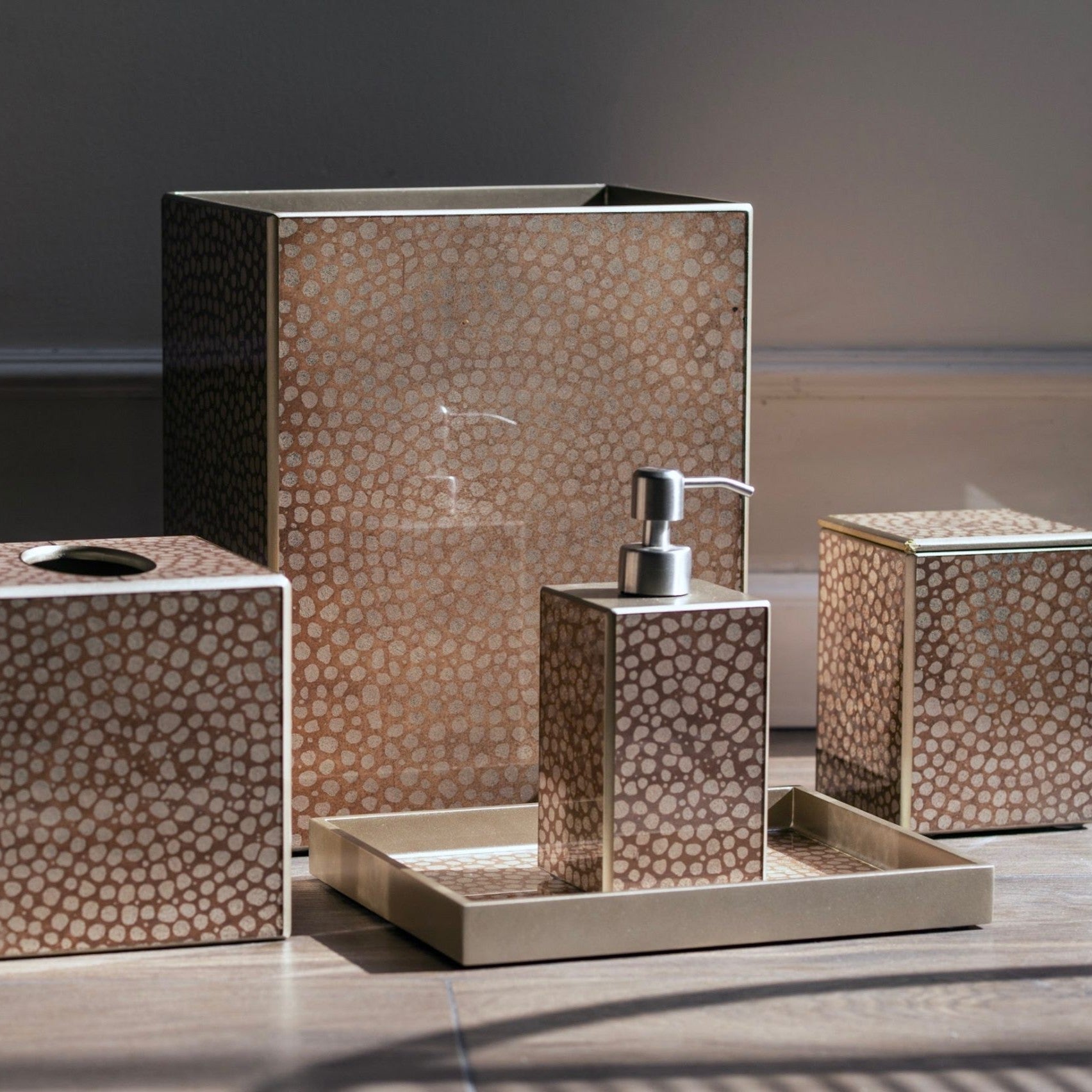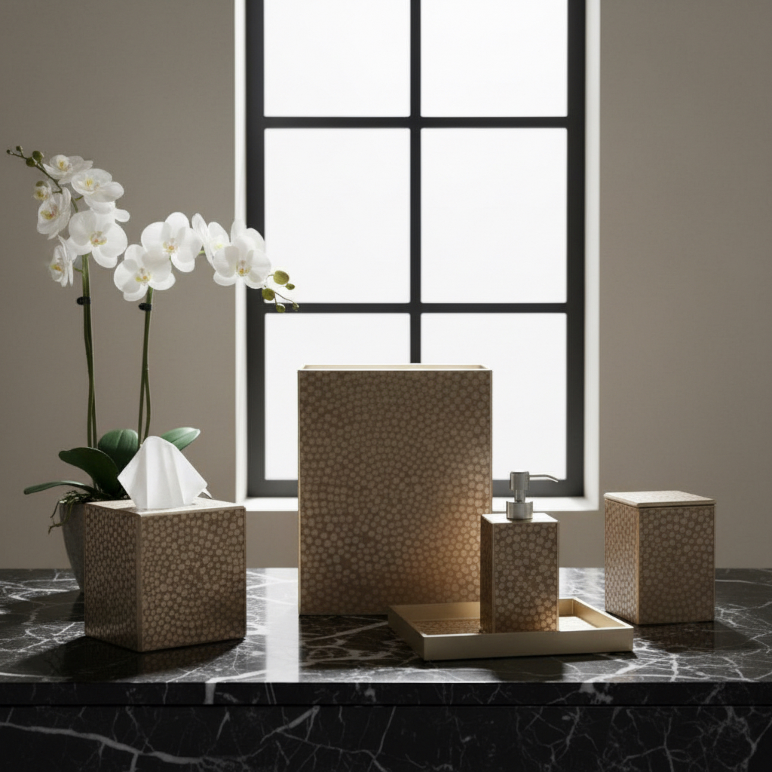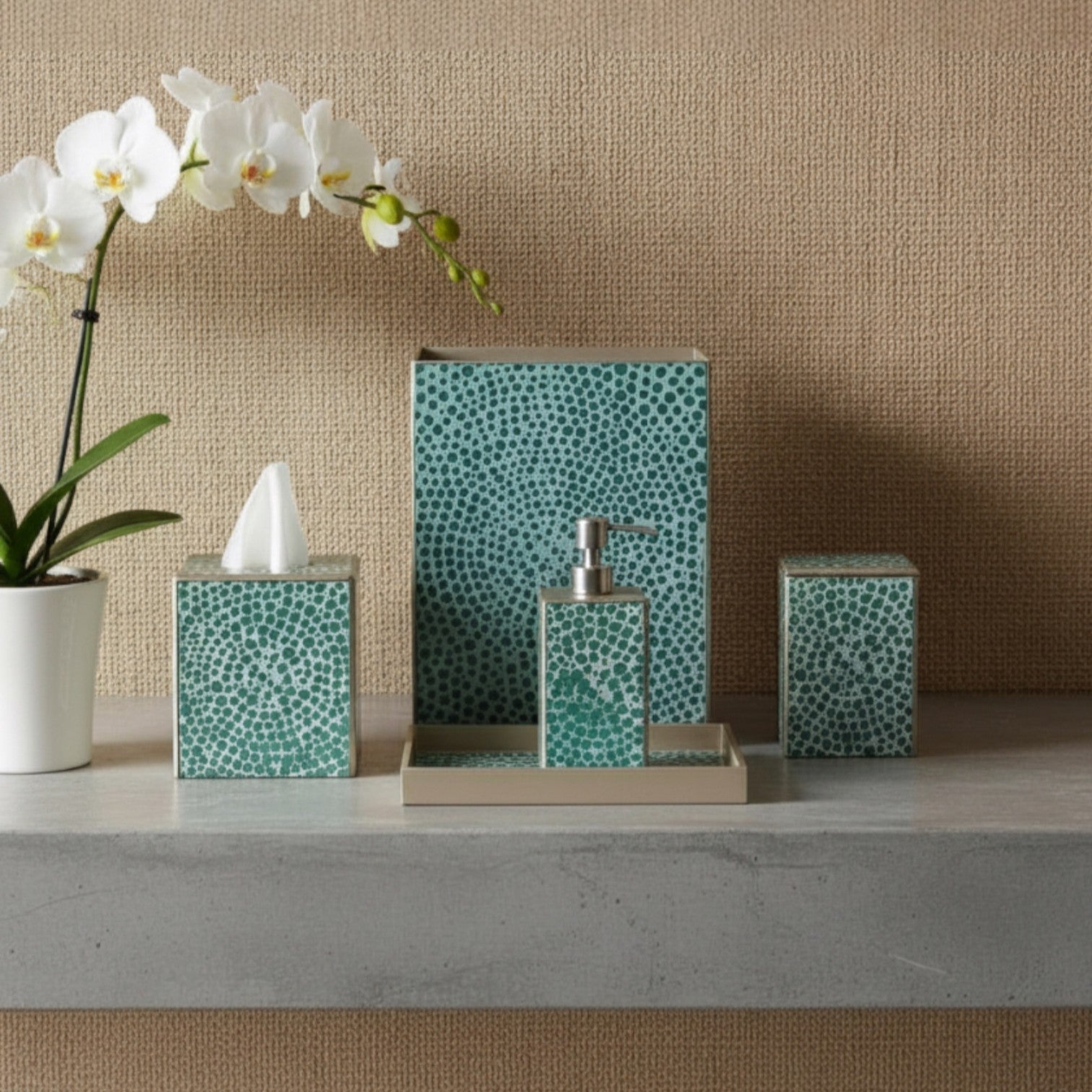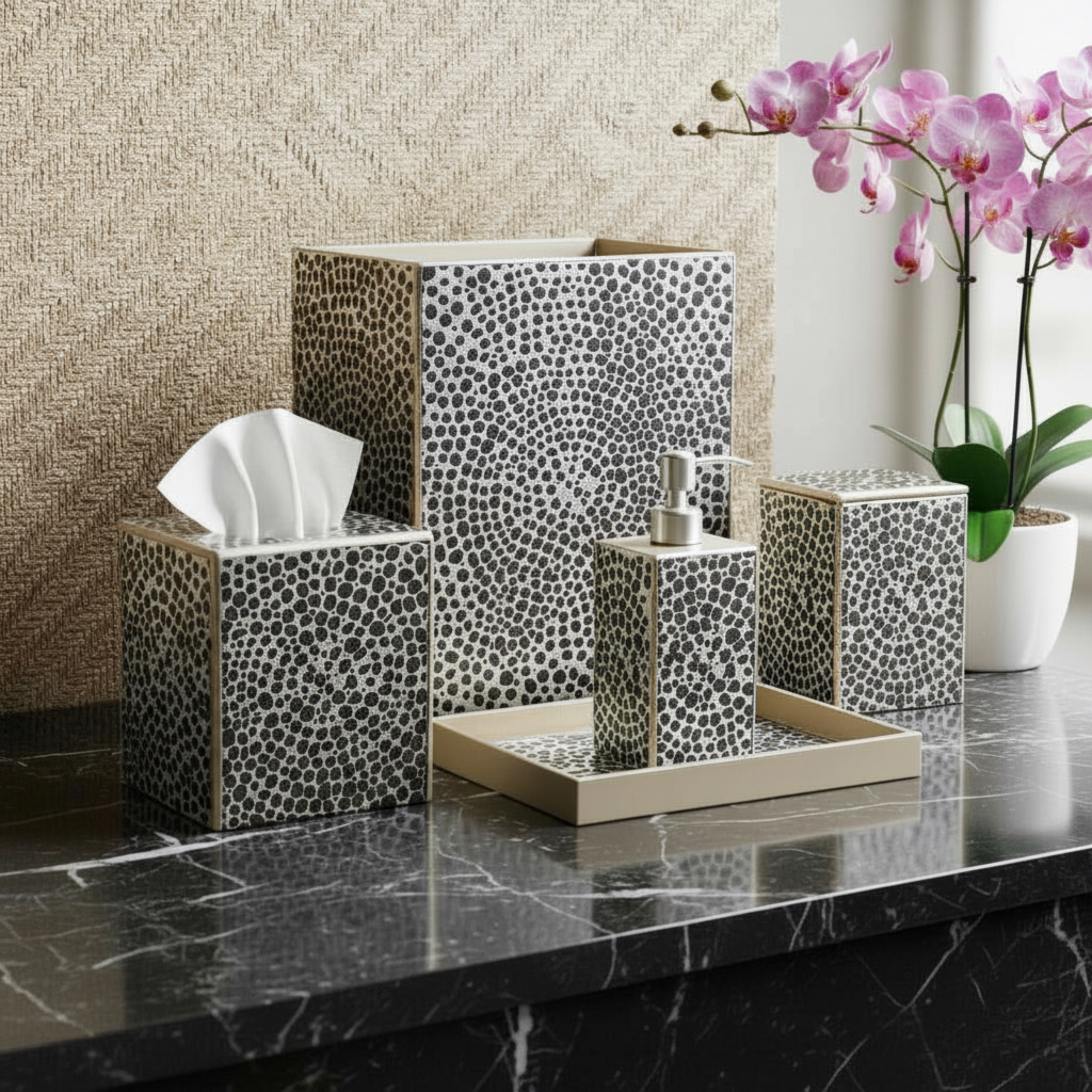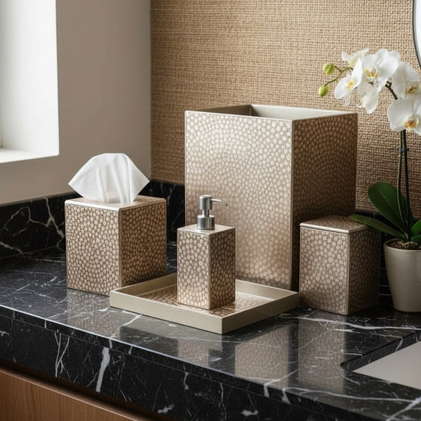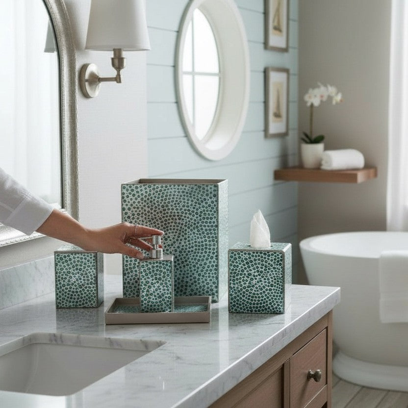 A classic Waylande Gregory mosaic pattern given a modern update. Entirely crafted by hand from start to finish, this luxury bath collection is made of artist hand-painted mirror in a version of verre églomisé. Made in Peru.